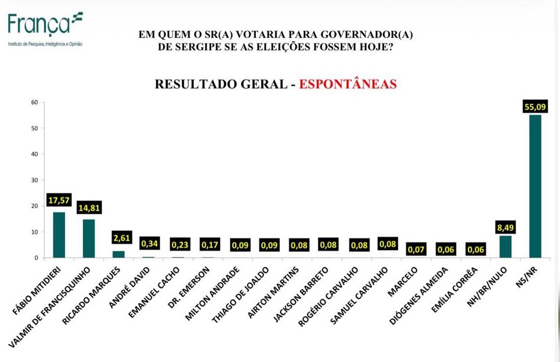 A liderança de Mitidieri é verificada tanto na espontânea quanto na estimulada, reforçando que o nome do governador está fixado na mente do eleitor: