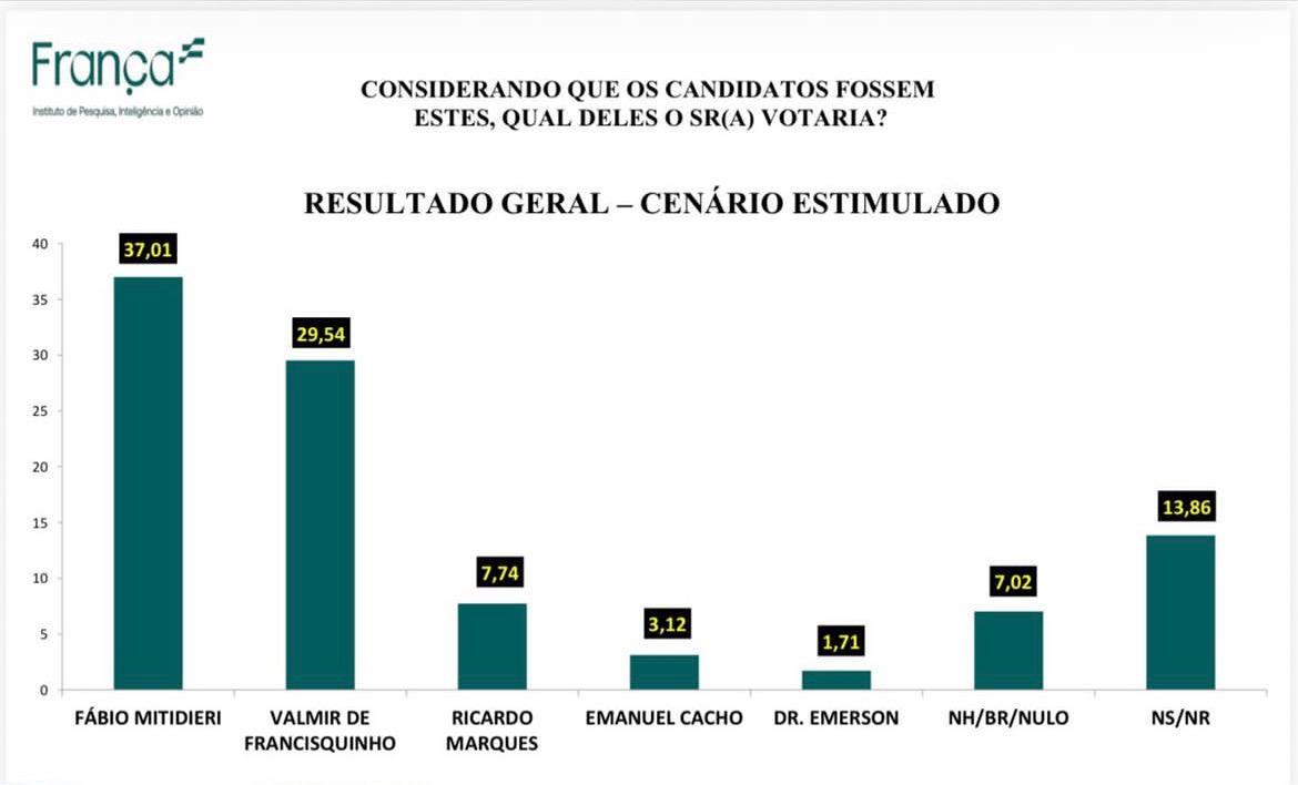 Cenário Estimulado: Fábio Mitidieri aparece com 37,01%, abrindo uma vantagem de mais de 7 pontos percentuais sobre o segundo colocado, Valmir de Francisquinho, que registra 29,54%.