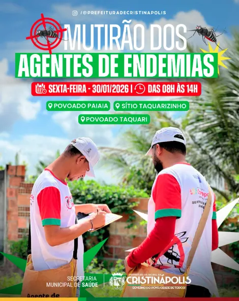 A Prefeitura de Cristinápolis, por meio da Secretaria Municipal de Saúde, promove nesta sexta-feira, 30 de janeiro, mais um mutirão de combate às endemias no município. A ação será realizada das 8h às 14h e contará com a atuação dos Agentes de Endemias.