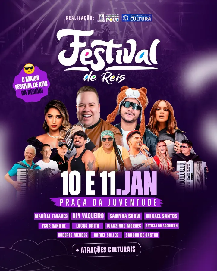Com uma programação diversificada, o festival contará com shows de Marília Tavares, Rey Vaqueiro, Samyra Show, Mikael Santos, Ygor Raniere, Lucas Brito, Luanzinho Moraes, Batista do Acordeon, Roberto Mendes, Rafael Salles e Sandro de Castro, além de atrações culturais que exaltam a identidade popular e mantêm viva a tradição dos festejos de Reis.