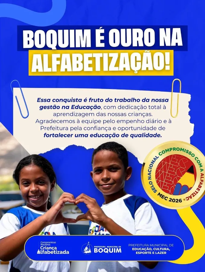 A gestão do prefeito Jackson Costa conquistou o Selo Ouro em Alfabetização 2025, concedido pelo Ministério da Educação (MEC) por meio do Compromisso Nacional Criança Alfabetizada (CNCA). O reconhecimento coloca Boquim entre os municípios brasileiros que alcançaram o mais alto nível de desempenho nas políticas públicas voltadas à alfabetização na idade certa, reforçando o protagonismo da atual administração na área educacional.
