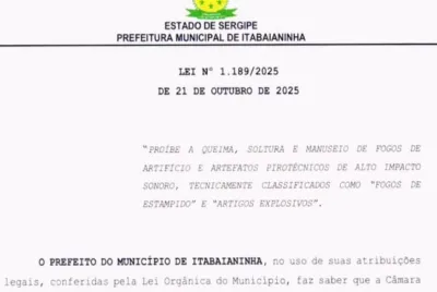 Itabaianinha passa a proibir fogos com estampido após sanção da Lei nº 1.189/2025